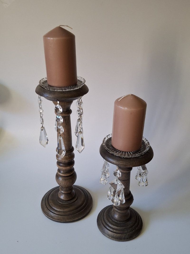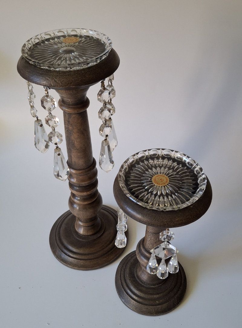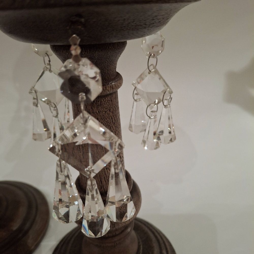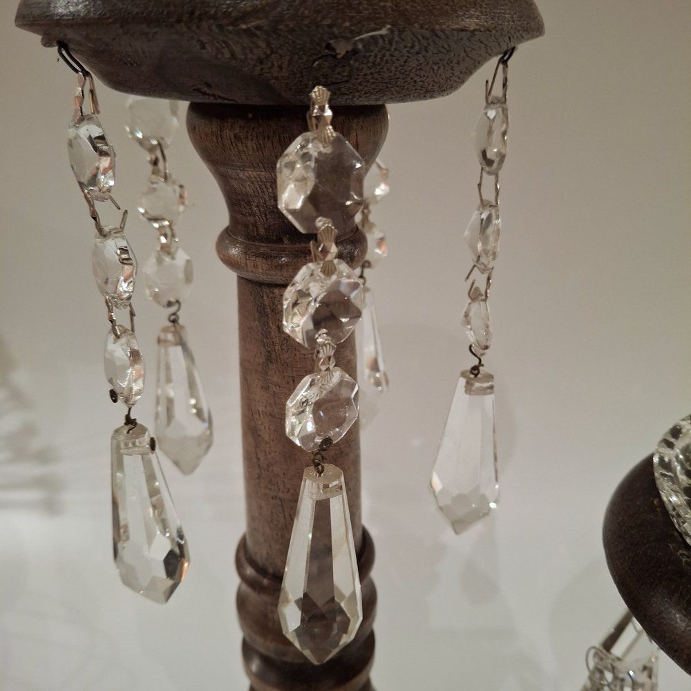 Holzkerzenständer mit antiken Kristallglas-Lüsterteilen