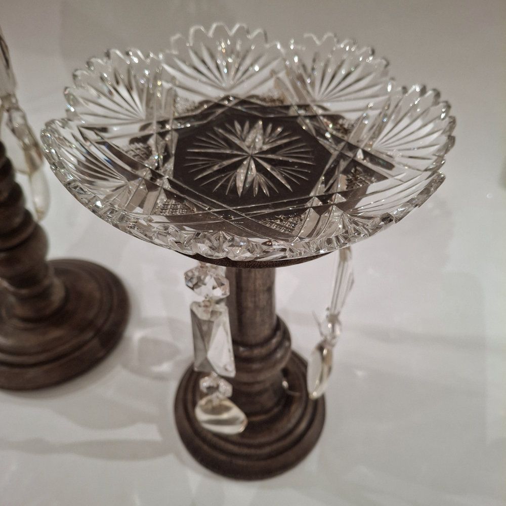Holzkerzenständer mit antiken Kristallglas-Lüsterteilen & Kristallglasteller