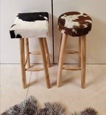 schöne und stabile Holzhocker - jeder ein Einzelstück und mit anderes geflecktem Fell.